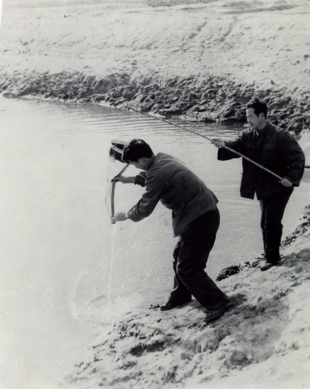 60年代末70年代初,池塘边水质检测和虾苗观察